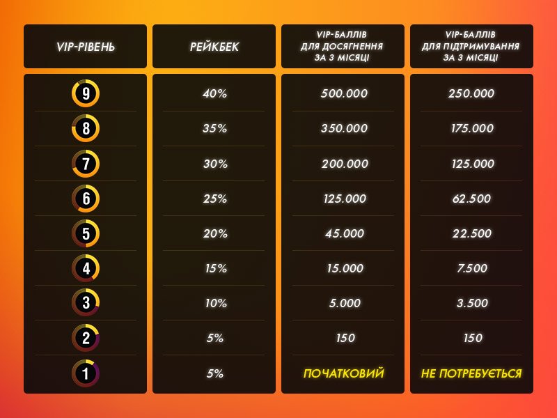 Рейкбек нараховується у вигляді VIP-балів, залежно від набраного вами рівня. Що вищий рівень, то більше балів.